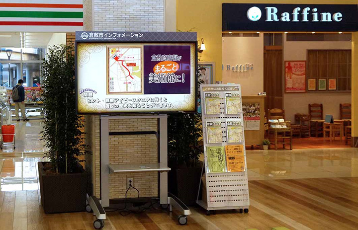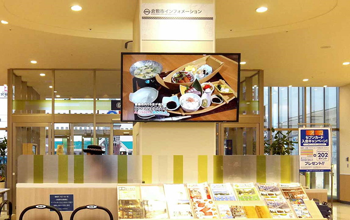 昨年末、全てのディスプレイを活用して、駅北口の大型複合商業施設と南口の商店街や歴史的な町並みを残す美観地区が連携してスタンプラリーイベントを開催。県外からのお客さまが、ディスプレイの案内を見て商店街や美術館などに足を運び大盛況でした。その後も、商店街恒例の朝市や、倉敷名所、ご当地グルメなどを紹介していますが、ディスプレイによる情報発信は注目度が高く、各イベント会場や観光スポットの来場者数増に結びついています。