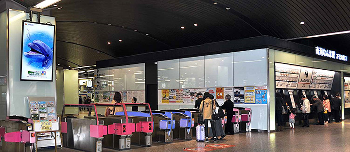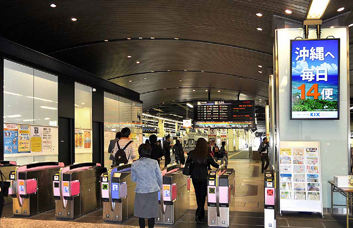 南海なんば駅の3階北改札口は当駅利用者の約7割が使用するメインの改札になります。この改札のリニューアルに伴い、構内のデザインにマッチした目新しい広告媒体を設置することで、広告収入増を目指していました。一方、紙のポスターでは、貼り替えの際、お客さまの通行の妨げにならないよう作業をする必要がありました。