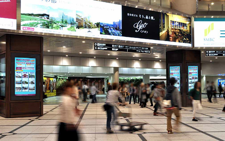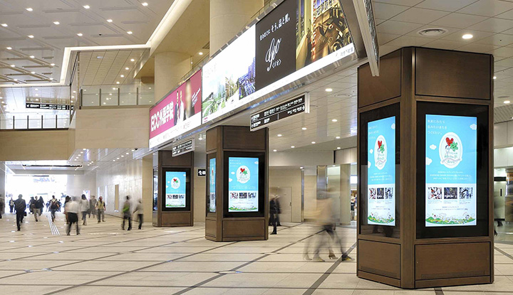 新コンコースに立つ柱の各4面に80V型デジタルサイネージ