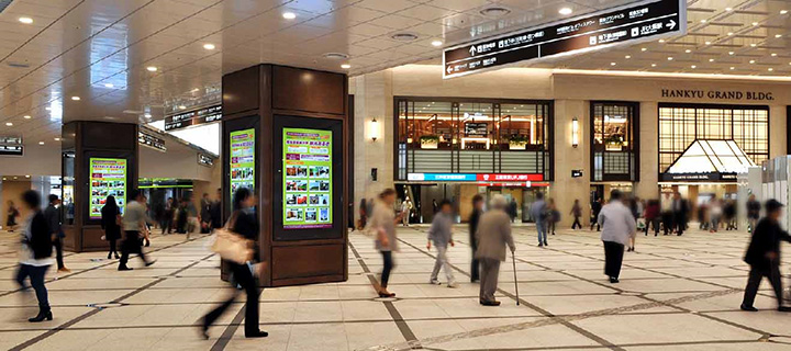 梅田阪急ビルの2期棟オープンに伴い、周辺コンコースの広告媒体についても見直しを決定。関西地区でも有数の通行量がある好立地を生かし、より訴求効果が高い 広告媒体を導入したいと考えていました。