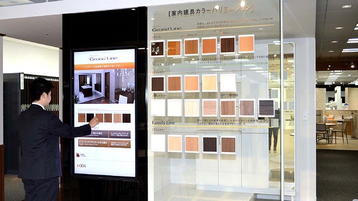 シャープのタッチディスプレイを導入することで、豊富な商品特長や住まいづくりのヒント、施工事例写真など、多種多様で膨大な量の情報をストックでき、簡単なタッチ操作でニーズに合わせてお客さまへ効果的にご提案できると考えました。また、デザイン・色ともに高精細かつ正確に表現でき、広い展示スペースを使って商品の説明パネルを何枚も並べることなく、タッチディスプレイ一台でまとめてご提案できることもプラス材料でした。
