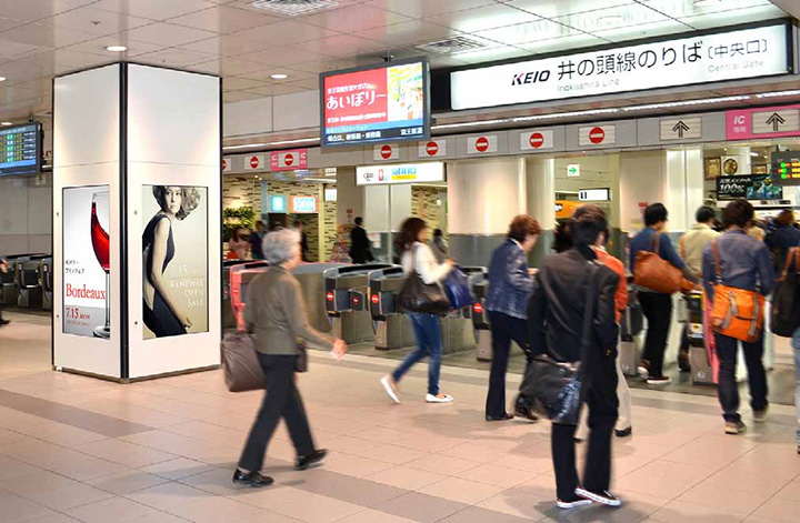2012年9月、京王電鉄井の頭線渋谷駅の改札外コンコースに立つ7本の柱に各4面、計28台を設置。