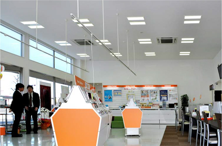 - 光束7000lmのスクエア型を導入することでauの照度基準をクリア。明るく入店していただきやすい店舗が実現しました。