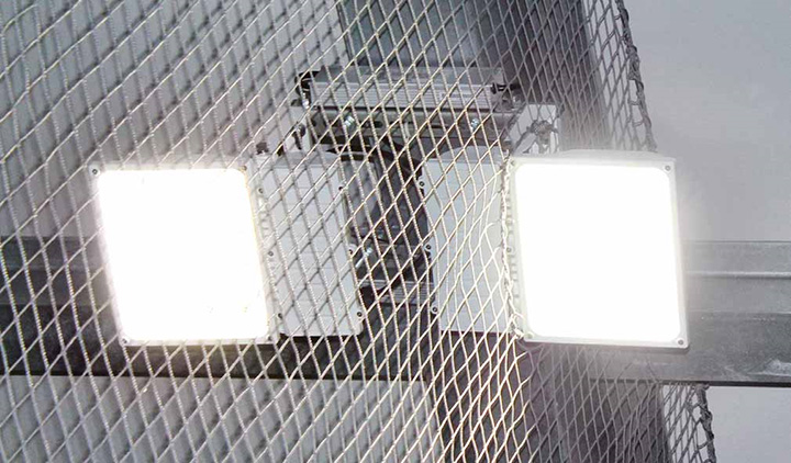LED投光器は水銀灯700W相当、22,000lmの明るさを約30%の消費電力で実現でき、ランニングコストが少なくてすむ点や、約6万時間と長寿命なのでメンテナンスも容易な点を評価しました。また、照度計算により、6mの高所からでも十分な床面の明るさが得られ、さらに、シャープ独自のレンズ設計で制御するエリア配光により、広く均一に照らし出し、まぶしさを抑えられる点もメリットでした。
