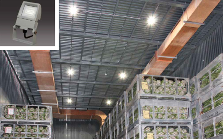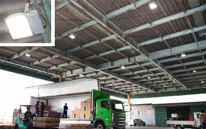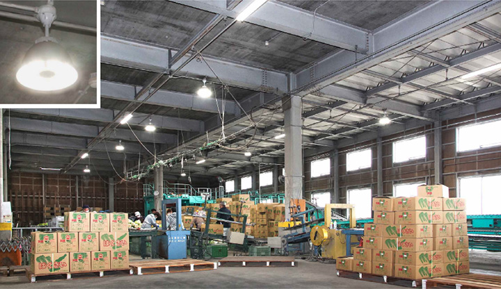 第1期導入として、倉庫・集出荷場など6施設の照明を先行して交換しました。高天井照明、投光器、反射笠型など、設置場所に応じた最適な照明を取り付けています。構内各所の照度が上がったことで、事故防止や野菜の選別作業の効率化をはじめ、労働環境の改善にもつながり、現場の職員から好評の声が上がっています。また、即時点灯可能なため、こまめな電源オン/オフが行え、職員の節電意識も向上しており、一層の節電効果を期待しています。