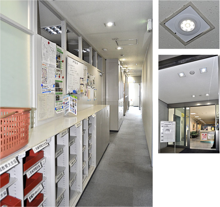 また、廊下のダウンライトには人感センサーを設置し、人が通る時だけ30秒点灯する設定にしているので、より高い省エネ効果を期待しています。さらに、玄関など来館者に目立つ場所にLED照明を導入したことで、コスト削減面だけでなく、省エネ対策の対外的アピールにも大きな効果を発揮しています。