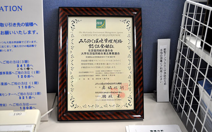 受付には、「みちのく環境管理規格認証登録証」を置き、環境への取り組みをアピール