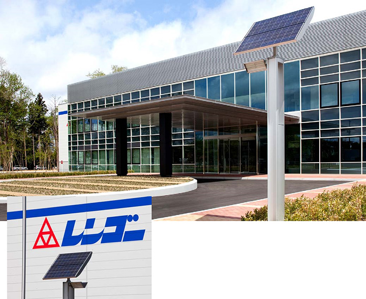メガソーラー規模の太陽光発電システムを導入するなど、先進の環境対策を結集した福島矢吹工場の正門周辺に4基のソーラー・LED照明灯を設置。ご来訪者に「環境配慮型工場」をアピールする広告塔としての役割も果たしています。