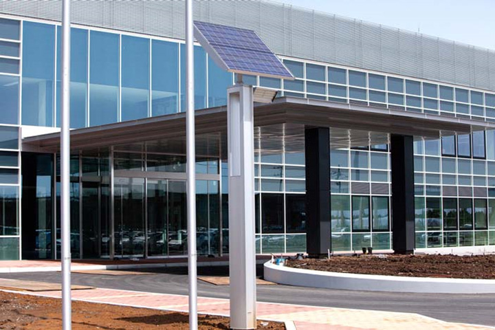 工場正門・正面玄関に設置されたソーラー・LED照明灯