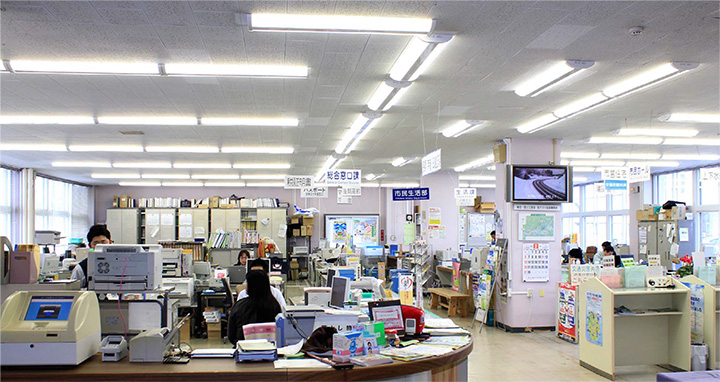 市庁舎が竣工後30年以上を経過しており、そろそろ寿命を迎える照明器具も増え、ちらつきが気になることもしばしば。安定器を交換するなど、そのつど対処してきましたが、コストがかさむばかりで、明るさにもばらつきが生じていました。そこでグリーンニューディール基金を活用して、市民の窓口になっている1~2階をLED照明に切り替えることにしました。