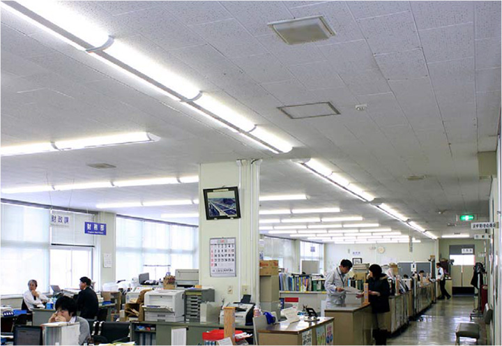 市庁舎が竣工後30年以上を経過し、そろそろ寿命を迎える照明器具も増えてきました。そこでグリーンニューディール基金を活用したLED照明の導入を決定。既存天井を活かした工事、これまで通りの明るさの確保が条件でした。