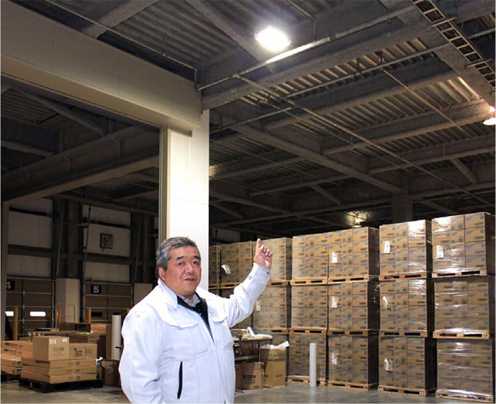 省エネ・長寿命の環境配慮型商品であることはもとより、高い天井でも十分な照度が確保できたことにまず納得しました。また、冬場の気温がマイナス10℃になることもありますが、対応温度がマイナス30℃~40℃と幅広く、低温時でも明るさがほとんど低下しない特長を知り、北海道という寒冷地の倉庫にも適した商品だと確信しました。