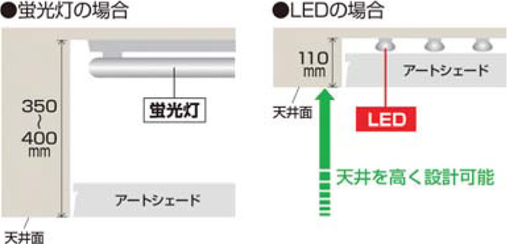 - 光のムラが発生しないので、光源のLEDとアートシェードの間隔が短くなり、天井を高く設計することも可能になりました。
