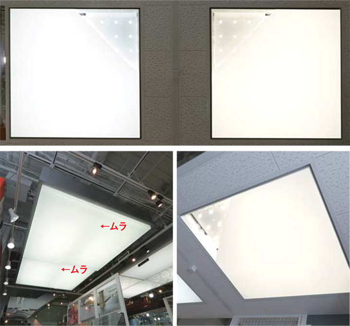(左下)蛍光灯を使用したシステム天井用照明器具。光のムラが発生している。