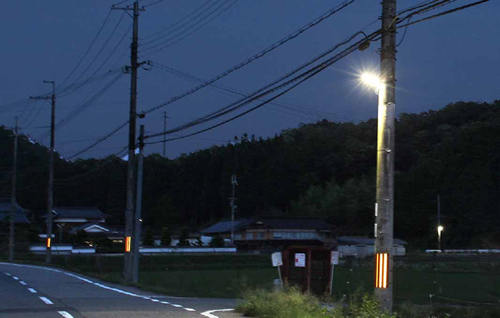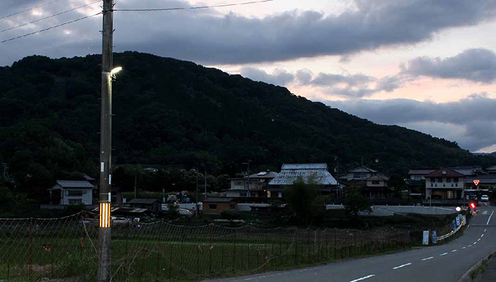 2005年以前に電柱へ設置した20W蛍光灯は、町が防犯灯として1,962灯、自治会が街路灯として1,357灯を維持・管理していましたが、老朽化が進み、置き換えを検討していました。一方、電力不足が全国的に懸念される中、公衆街路灯の省エネ化は必須課題であることに加え、佐用町は県から「星空景観形成地域」に指定されており、上空に光が漏れる光害を回避できる屋外照明器具を選ぶ必要がありました。