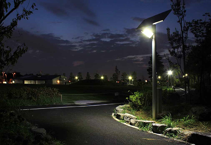 広場外周のウォーキングコース沿い、及び駐車場に設置していますが、利用者や周辺住民の方からは非常に明るいと評判です。また、隣接する中学校の通学路にもなっているため、防犯面での効果も期待されます。一方、点灯によるCO2排出や電気代がゼロに抑えられるメリットもあります。
