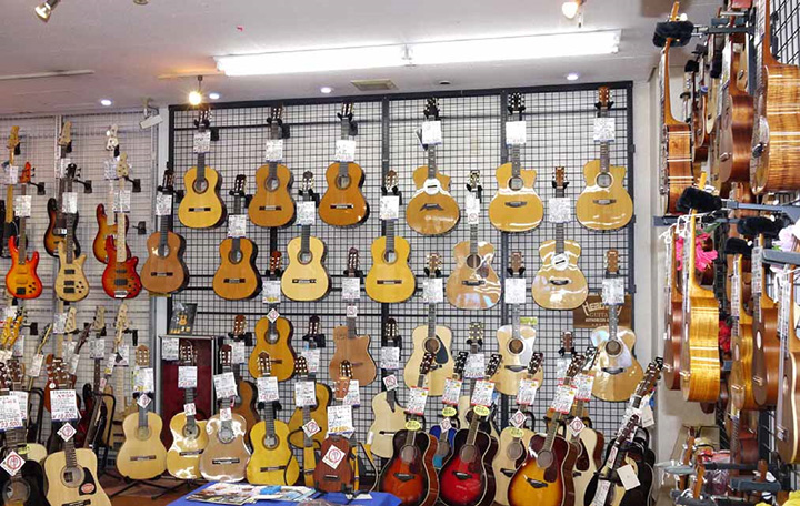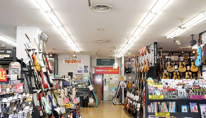 ギターなどの展示楽器の光沢が強調され、お客さまの注目度がアップした1階・楽器売場