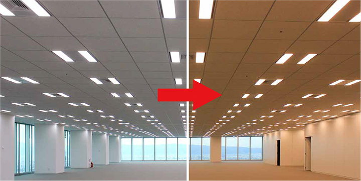 - 照度センサーによる自然光を活かした省エネ、時間帯に合わせた照明制御で仕事の能率向上も付加価値に。