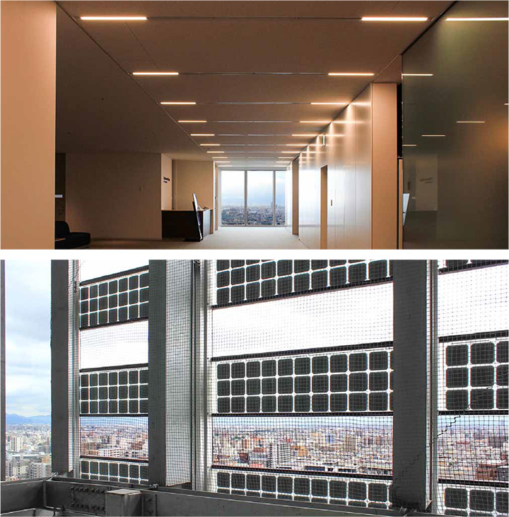 - 建材一体型太陽電池モジュールは、ビル外装ガラスと同様の設置強度を保持。ビルのデザインにもマッチ。
