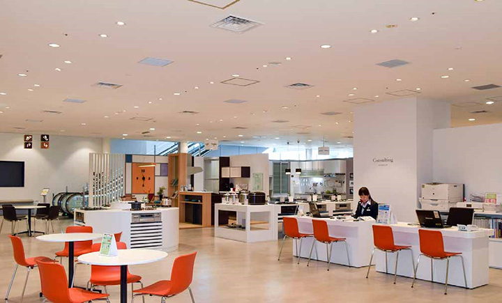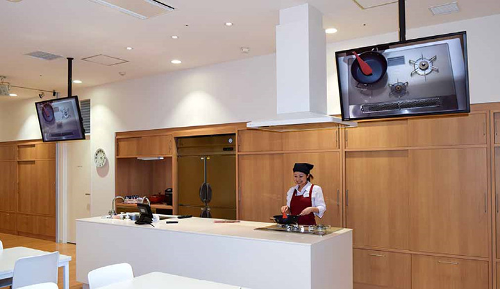 ユニバーサルダウンライトで壁面を効果的に演出 キッチンスタジオにはシャープのディスプレイも導入