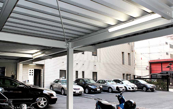 車庫には耐候性にすぐれたステンレス仕様の軒下用を選定