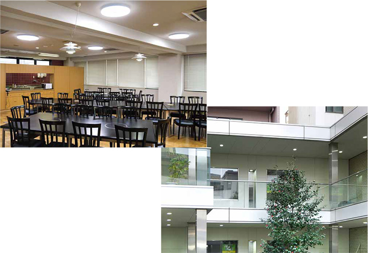 食堂(シーリングライト)(左)、中庭(LED電球)(右)