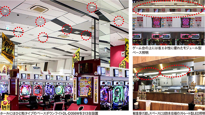 改装オープン後はホール部分が均一に明るくなり、心地よい娯楽スペースが誕生。新台の増加とも相まって、平日で従来の約150%、週末は約160%のお客さまをお迎えするようになり、店内は連日大盛況。店舗まるごとのLED化がリピーターの増加にも貢献しています。また、店内の雰囲気づくりが集客の鍵を握る娯楽施設にとって、ラインアップが豊富に揃い適材適所の機種が選べることは大きな利点で、トイレの壁面を柔らかい光で効果的に照らし出すなどデザインにも優れ、女性客の増加に一役買っています。