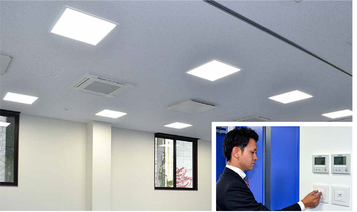 新社屋の照明をすべてLED化したことで、必要な照度を十分確保しながら電気代を削減でき、長寿命なので管球交換などの手間も減らせます。また調光可能な埋込スクエア型を設置した会議室では、プロジェクター使用時にスクリーン付近の照明だけを暗くできるようになるなど利便性も向上。より一層の業務効率化を図ることができました。
