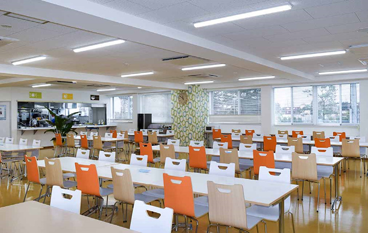 食堂のLED照明も自然な灯りを実現