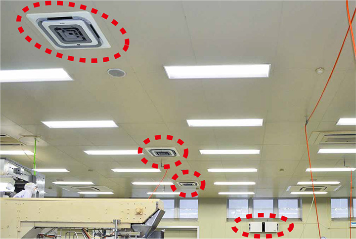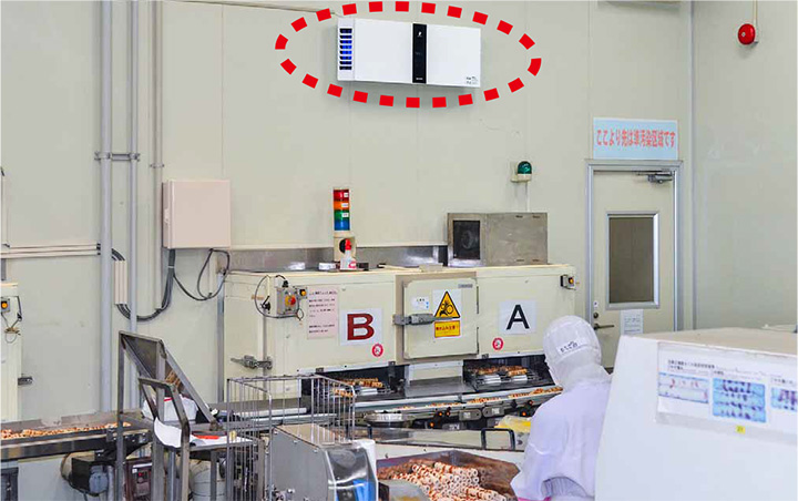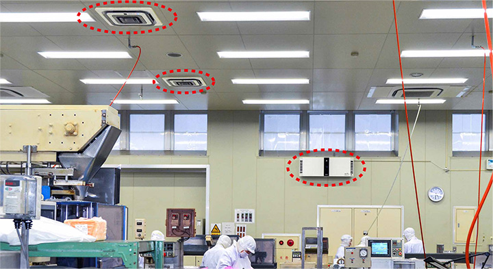 当社北陸工場のちくわや揚げ物の包装ルームに、天井埋込型と壁掛け/棚置き兼用型を設置。クリーンな空気環境が実現し、衛生管理を一段と強化することができました。これまで室内に充満していた揚げ物油のニオイも低減でき、従業員がより快適な環境で働けるようになりました。