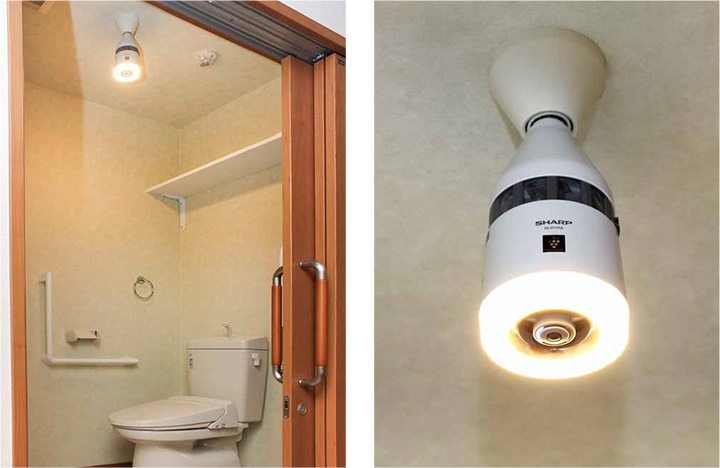 全居室トイレと共用トイレに天井設置型イオン発生機を設置。脱臭効果だけでなく、人感センサー付きLED照明で消し忘れも防止