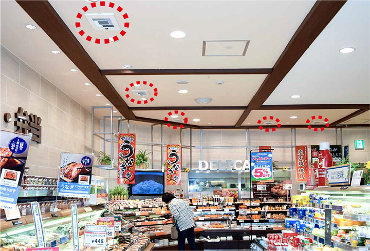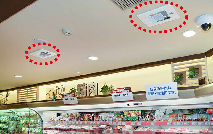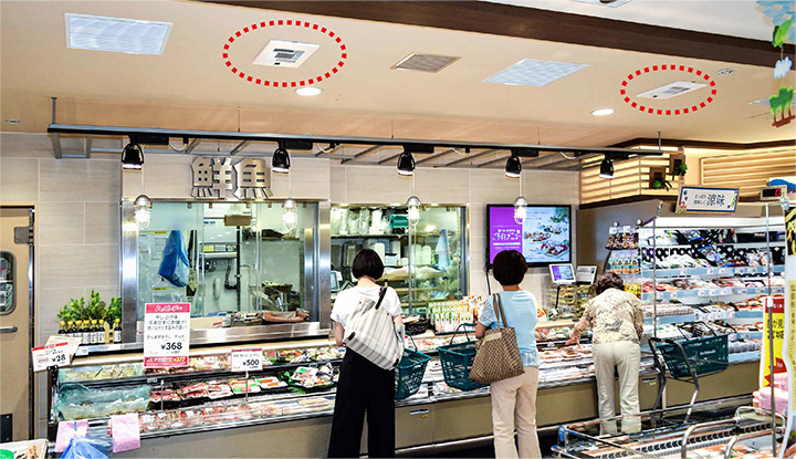 冷蔵食品コーナーでは冷気による結露で天井にカビが発生し黒ずむことが課題でした。これまでは都度天井塗装などで対応していましたが、コストがかさんでいました。また、惣菜コーナーの揚げ物などのニオイが、他の売り場まで広がることも課題でした。