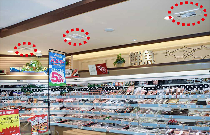 2016年4月、1階フロアの鮮魚・精肉コーナーの天井に13台、2階フロアの惣菜・乳製品コーナーに5台設置。