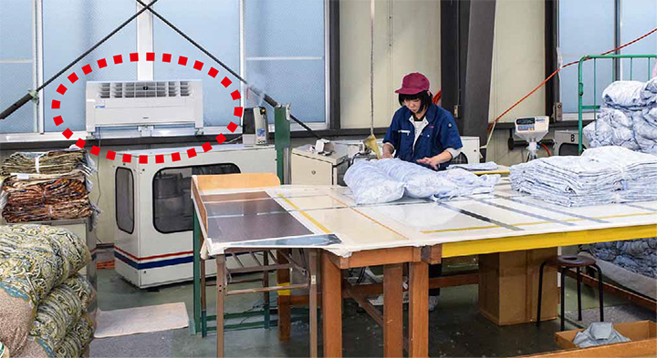 静電気が作業の妨げになる羽毛充填場にも床置き型を設置