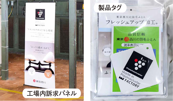 選別機への導入だけでなく、羽毛充填場には床置き型を導入し、静電気の除去効果でスタッフの作業効率をアップさせています。今後も生産効率を上げるため、必要箇所への設置は随時検討しています。一方、今回のプラズマクラスター導入は製品のタグや工場内のパネルで訴求しており、品質へのさらなる信頼向上のアピールにつなげていきたいと考えております。