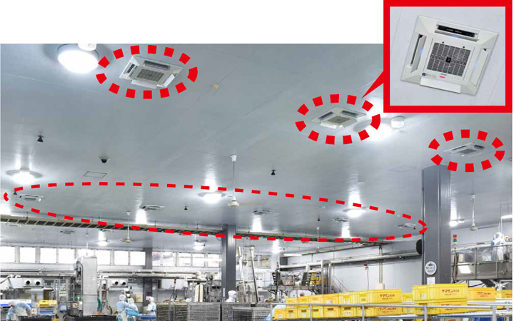加工済み食品の包装作業エリアに天井埋込型プラズマクラスター機器を24台導入し、24時間後に浮遊菌を測定すると、一般細菌が88%、カビ菌が90%減少しました。連続稼働中の現在はさらなる減少も期待でき、食の安全性向上への寄与やカビの減少も実感しています。また、こんにゃく等の食品のニオイを抑制して作業者の負担を軽減したり、除電効果によりプラスチック製の包装パックの静電気を除去できることから、パックの2枚取りが減り、包装作業の効率アップにもつながっています。