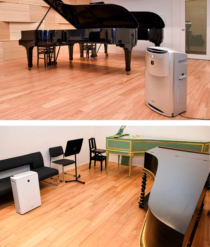 各部屋の広さと空気清浄能力から設置台数を算出した際、他メーカーの空気清浄機と比べ適用床面積別の豊富なラインアップがあり、適切な機器を選択できたことで、導入コストの抑制につながりました。また、楽器の“天敵”のカビ菌や静電気、大人数での演奏後にこもるニオイに対するプラズマクラスターの効果にも期待し、導入を決めました。