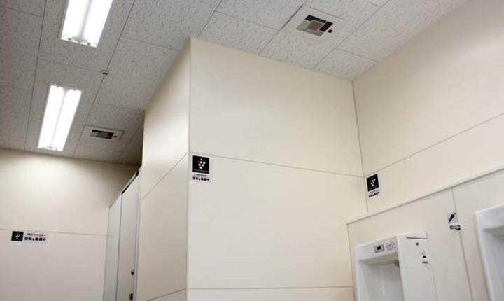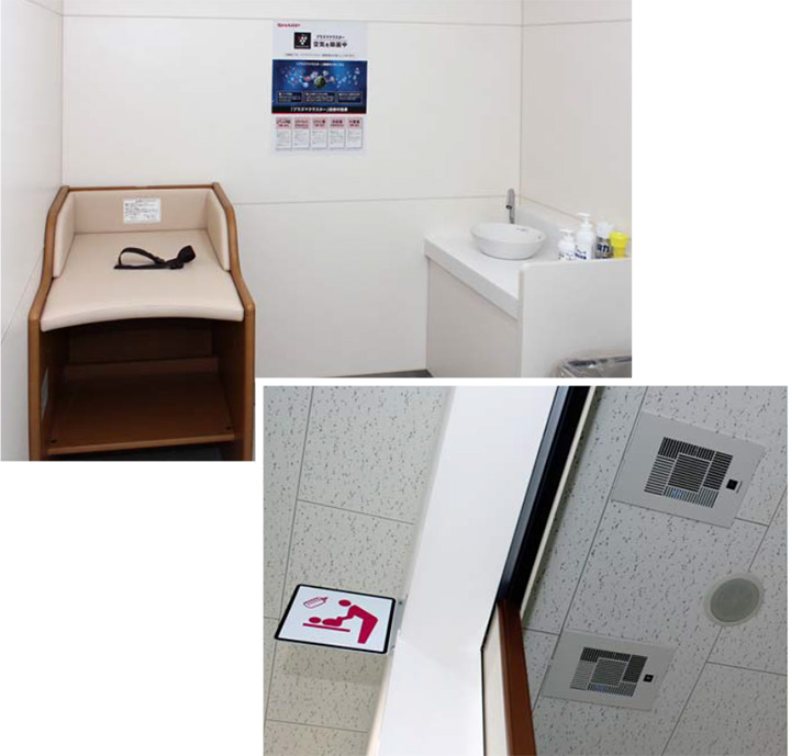 トイレや授乳室の中には天井埋込型を、その前の通路には大型の業務用イオン発生機を設置し、エレベーターもプラズマクラスター搭載タイプを採用しています。いずれも空気環境が意識される場所で、“顧客満足”の評価を左右する空間です。