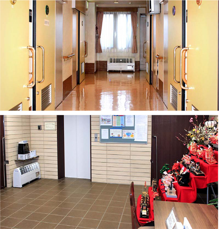 (左)各個室前の廊下