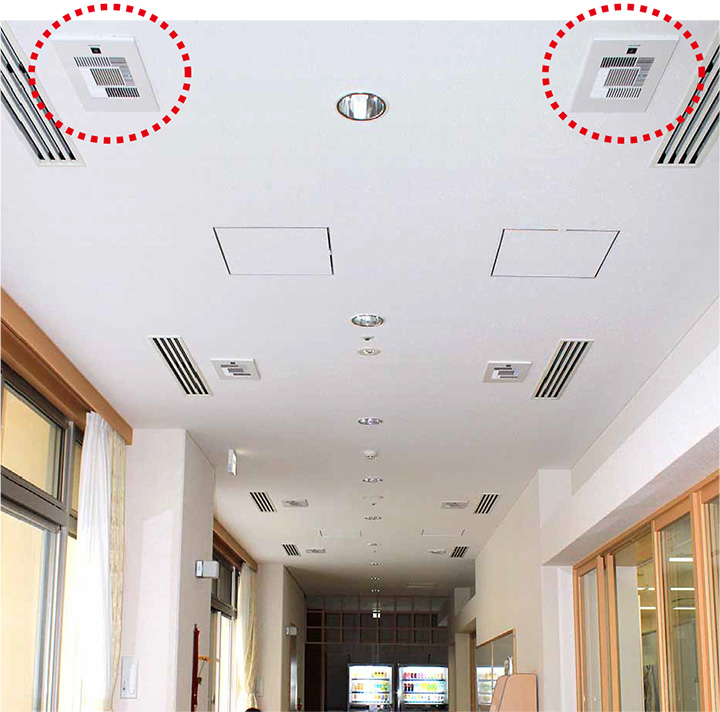 廊下の天井埋込型イオン発生機。厨房やトイレにも同タイプを導入
