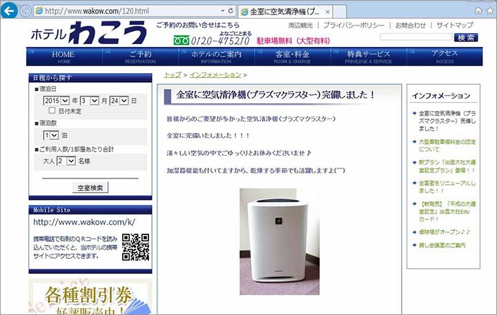 2015年2月、客室の空気環境向上のため、シングル79室、ツイン13室、ダブル2室、和室6室の全100室に各1台ずつ導入。