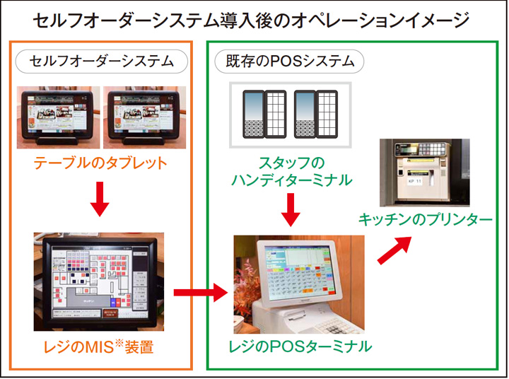 セルフオーダーシステムを導入するにあたり、まずは特に課題 のあった4店舗への先行導入を、シャープの担当者に依頼しました。3ヵ月間という短い納期指定にも関わらず、既存のPOSとハンディターミナル、キッチンプリンターなどを結んでいたネットワークの中に、新たにタブレット端末と、その全端末を管理するMIS装置※を組み込む形で、セルフオーダーシステムを導入できるノウハウを評価。他社製の機器も含んだシステム構築に対するシャープ側のワンストップ対応にも満足できました。