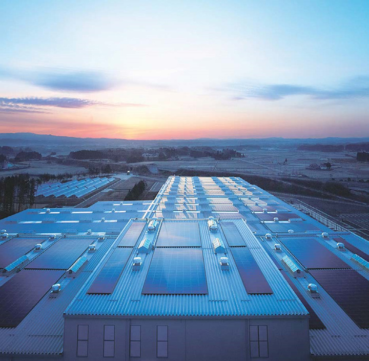 新設された福島矢吹工場の屋根上と地上に、計8,532枚の太陽光パネルを導入。2010年2月稼働。総発電容量1,535kW、年間発電能力約145万kWh。