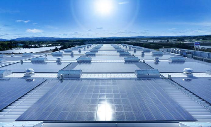 工場の屋根一面に太陽光パネル。発電だけでなく遮熱効果も高い