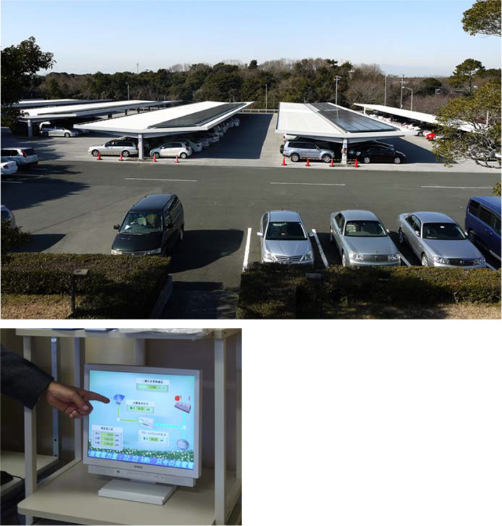 駐車場屋根を利用して、パネルを設置。発電量は、社長室で管理