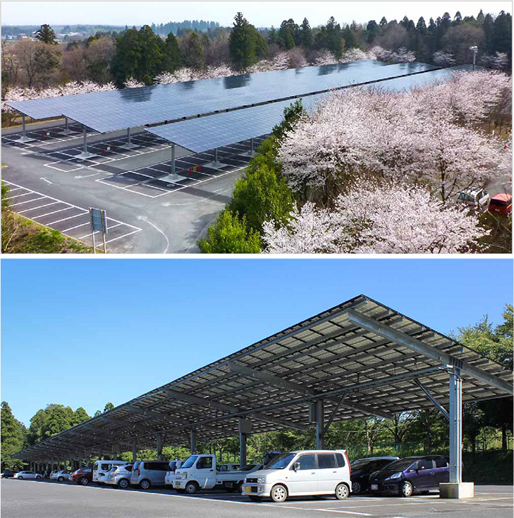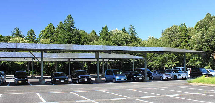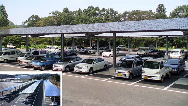 (上)約500kWの太陽光発電システムを設置したソーラーパーキング