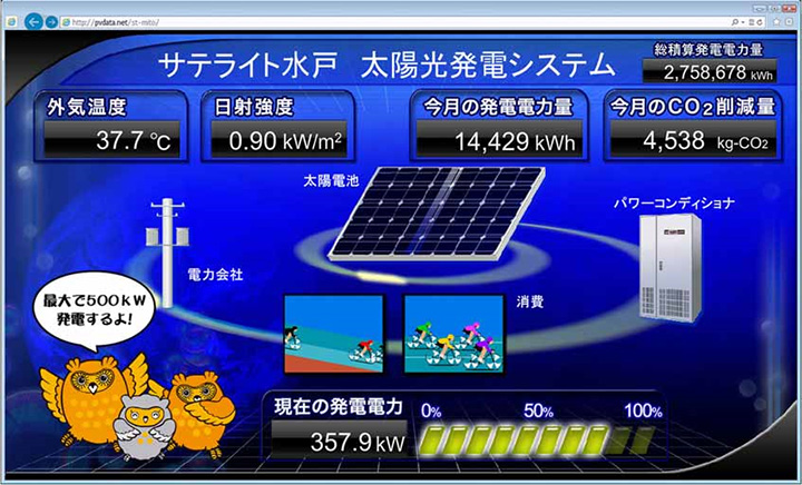 国の補助事業「平成21年度新エネルギー等事業者支援対策事業」の採択を受け、サテライト水戸の駐車場に設置。2010年2月稼働。平均年間発電量約62万kWh。