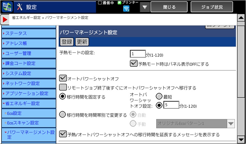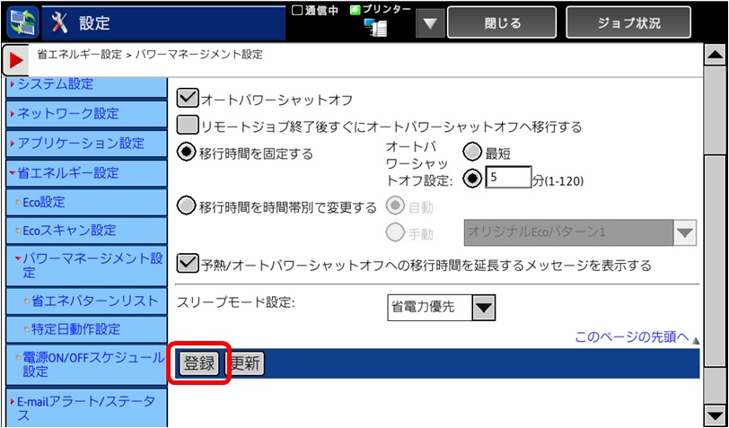 ⑤パワーマネージメント設定では、オートパワーシャットオフの入/切の設定や予熱モードの設定をします。 設定を終了したら、[登録]キーをタップする。
