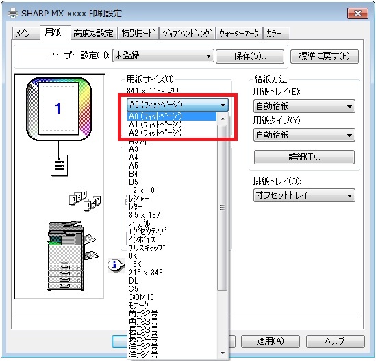 プリンタドライバの用紙サイズに表示される[A0(フィットページ)]はどのように使うのですか?(FAQ No.00393)