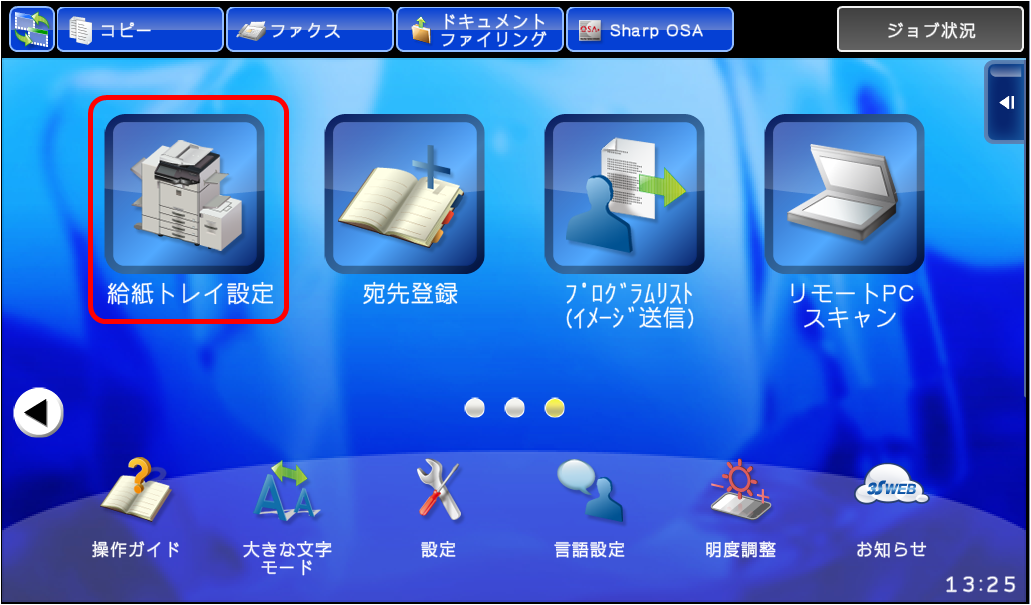 ①ホーム画面の[給紙トレイ設定]キーをタップします